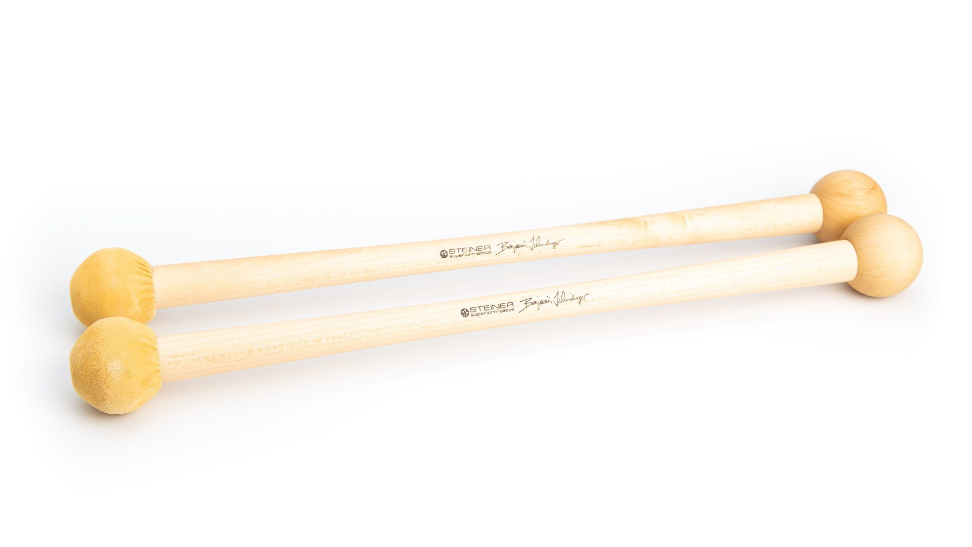 The shaft is turned from maple, the bare wooden head from the more robust hornbeam. The leather side is rounded off tonally with a thin layer of felt under the leather.